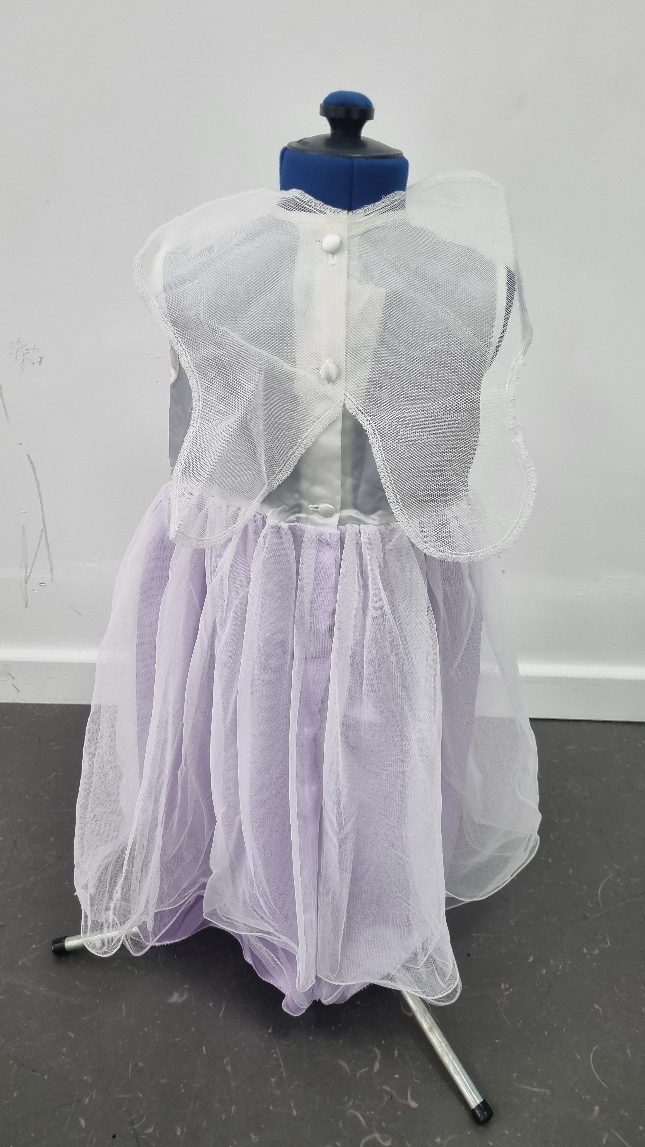 White satin body with ribbon belt, and purple and white tulle skirt. Wings on the back. B63