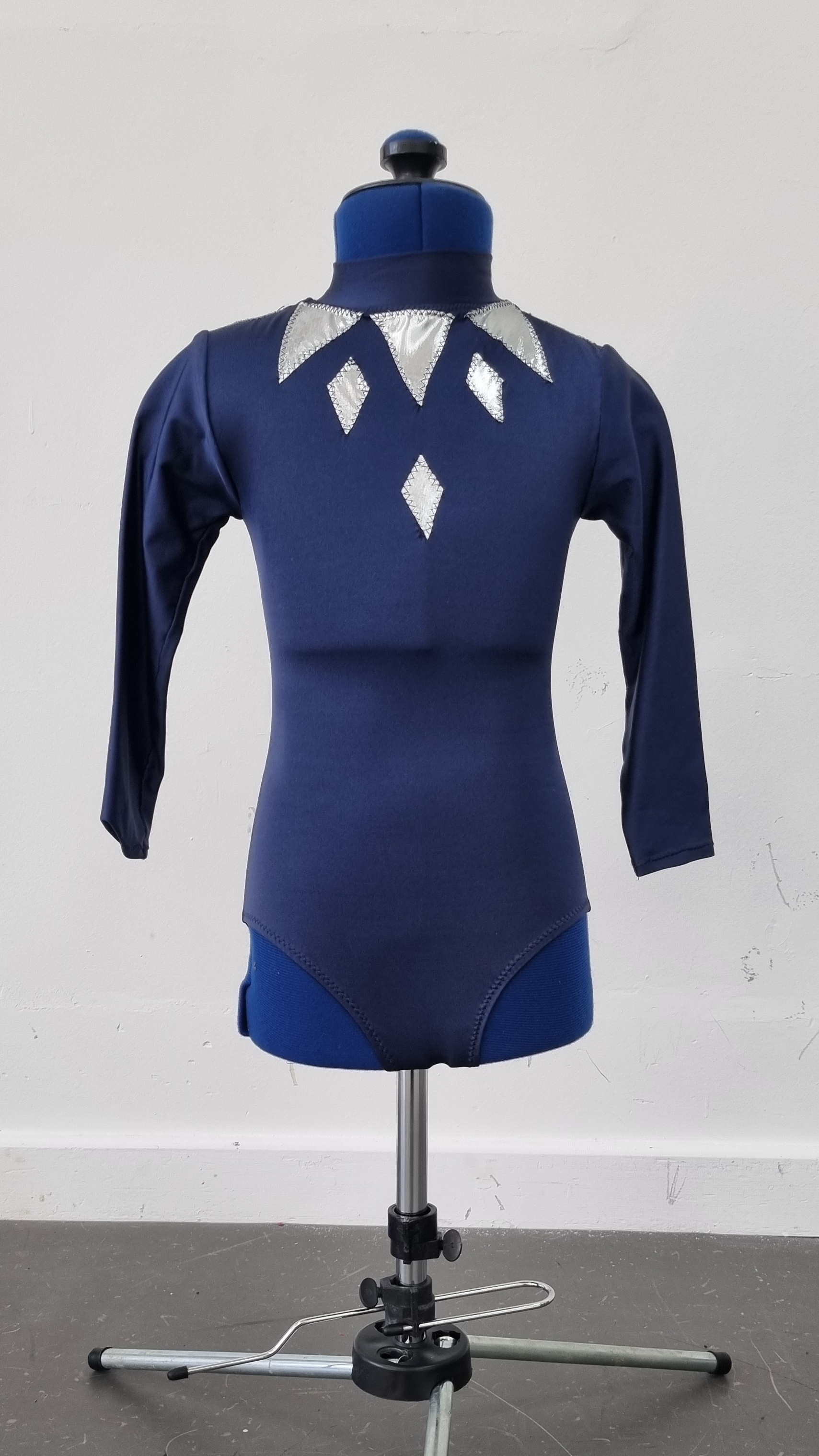 per weekNavy high neck, long sleeved, zip back leotard with silver detail around neck. Matching short circle skirt. There is a matching catsuit available. Custom made. B41 * 3 x spare skirts.