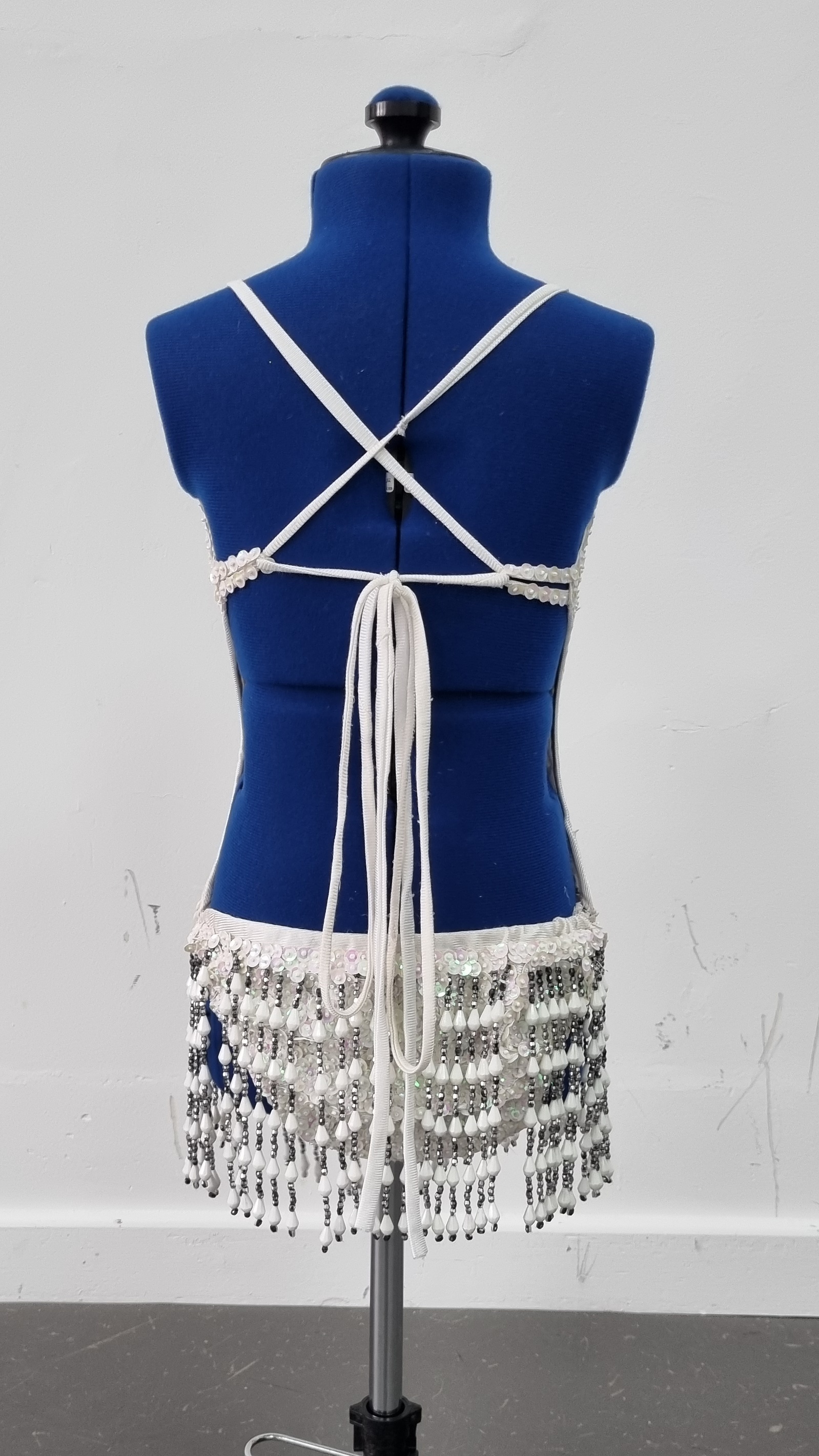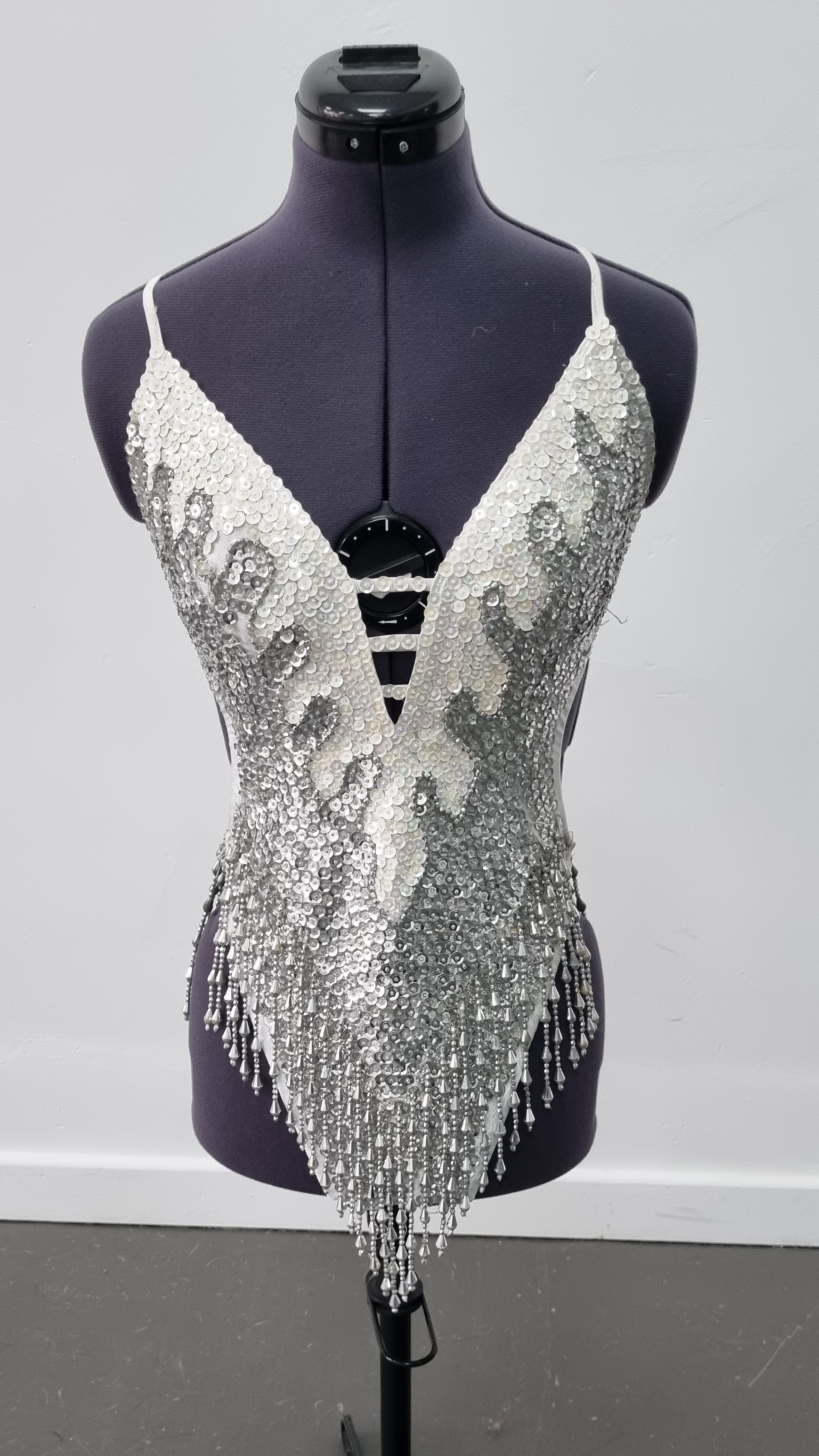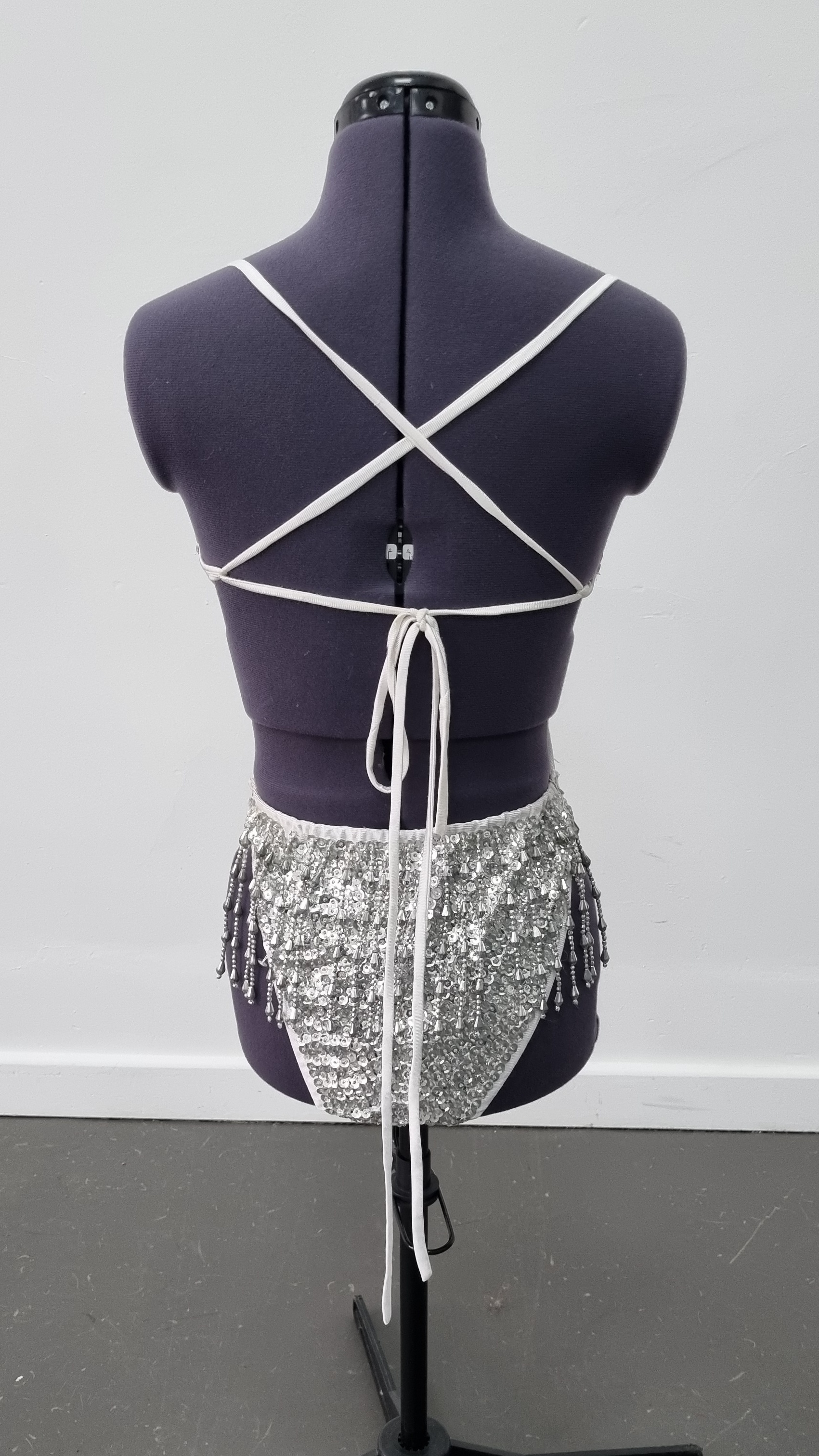 per weekWhite fully beaded leotard with tie back and neck (will fit smaller and bigger due to this). 2 slightly different designs. S33