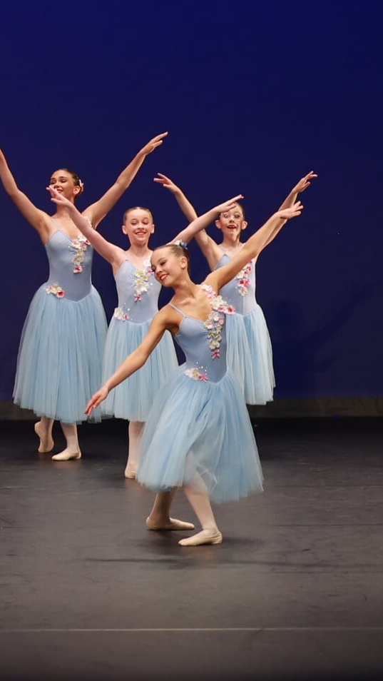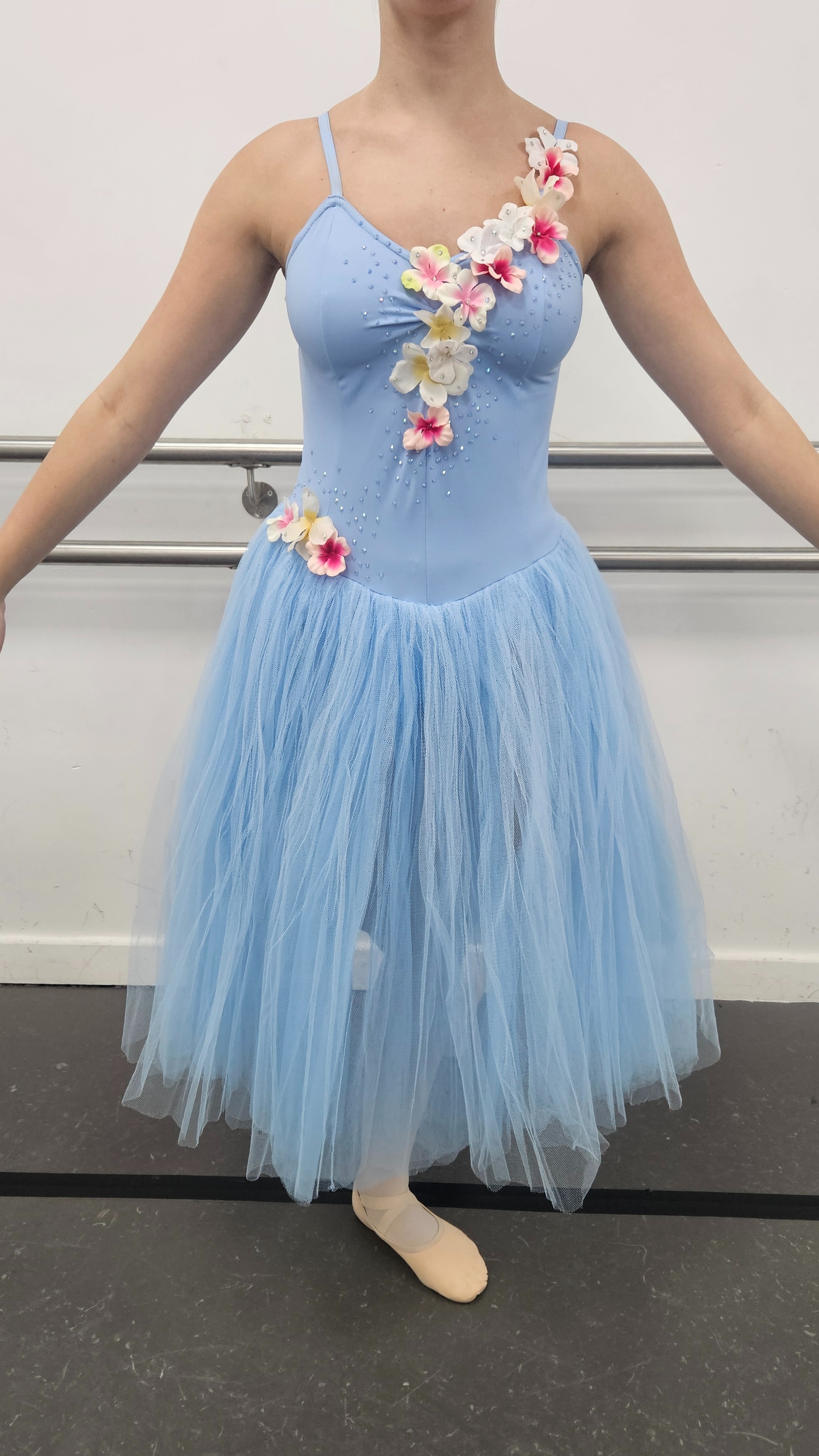 per weekPastel blue romantic tutu with lycra rouched bodice and custom flowers. Size 2 x7, Size 3A x7, Size 3 x2. Size 4 x1 (one size 2 has a 3A length skirt). R8A