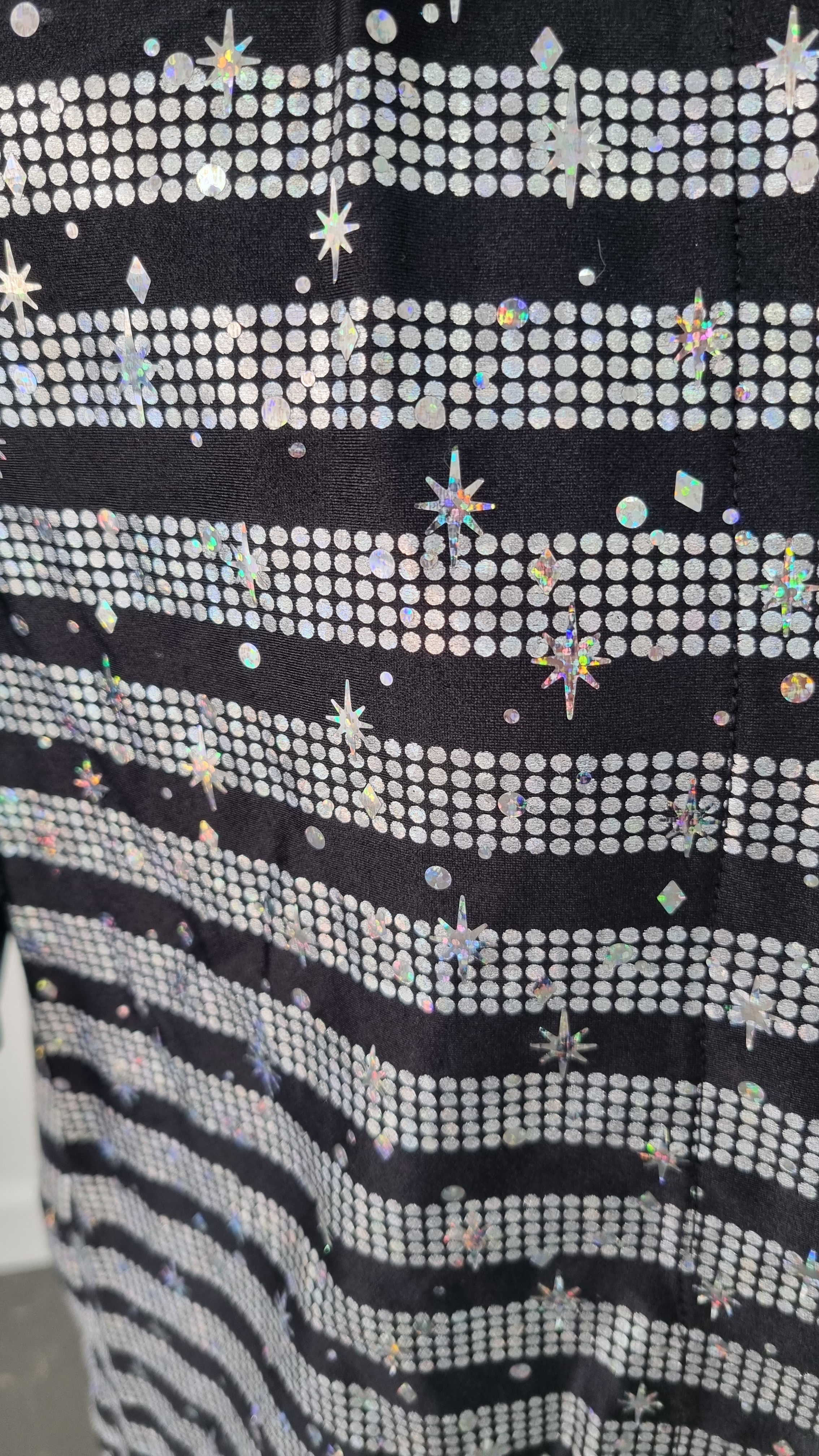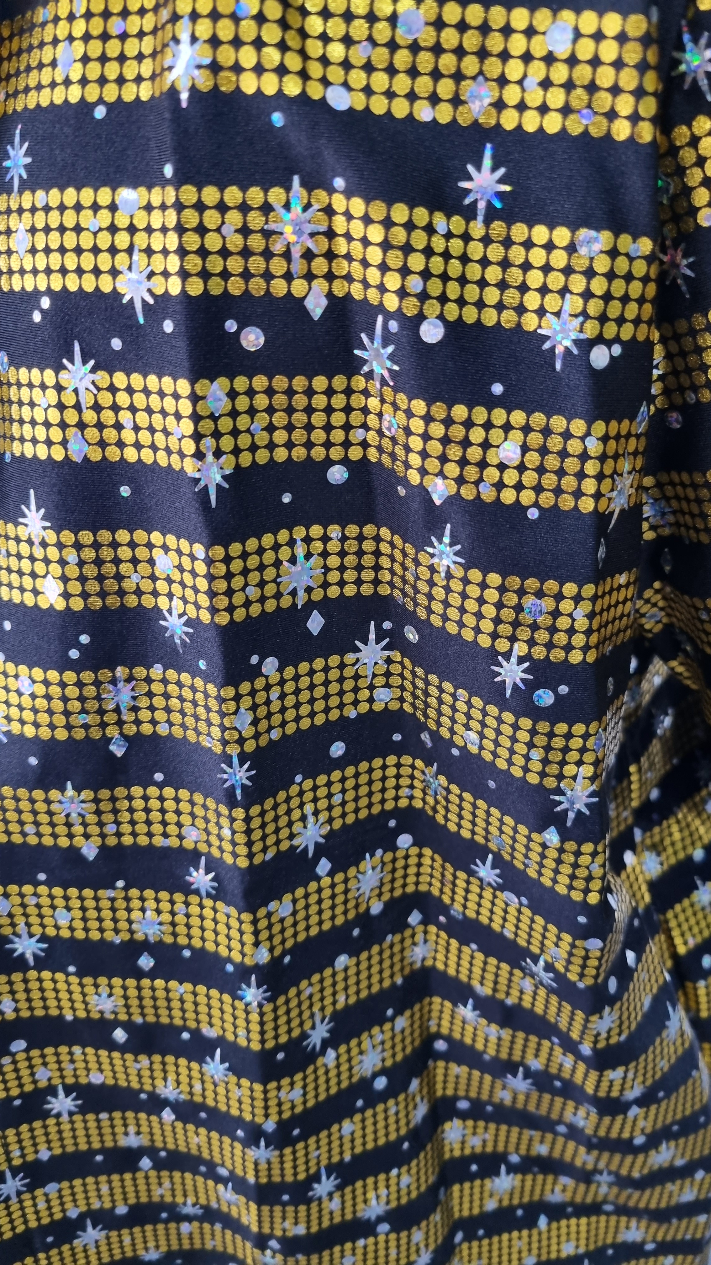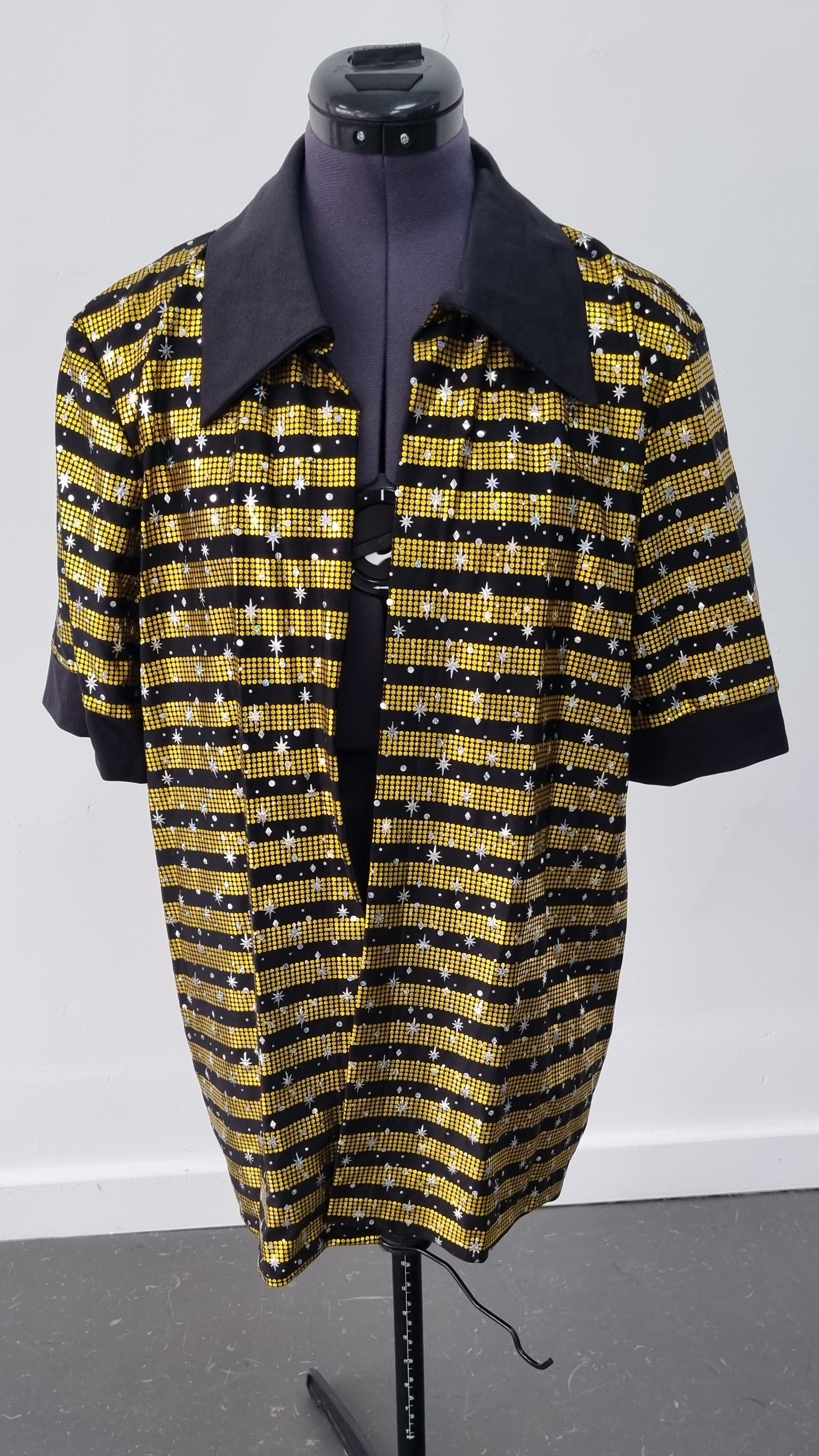 per weekAvailable in silver (white), with one gold (yellow). Open shirt with metallic stripe pattern. Custom made, approx ages 13-18. R18B