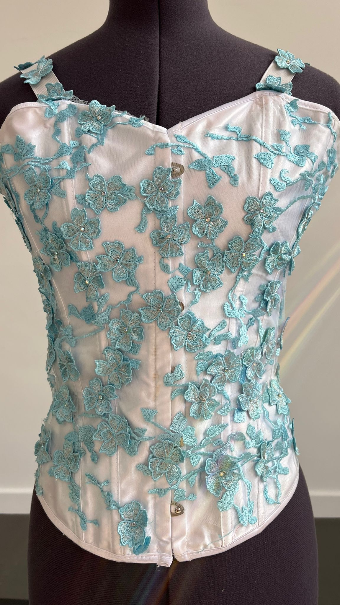 per weekWhite structured corset with blue applique, added elastic straps and ribbon back. Size could fit XS-S. Matches romantic tutus. R11A